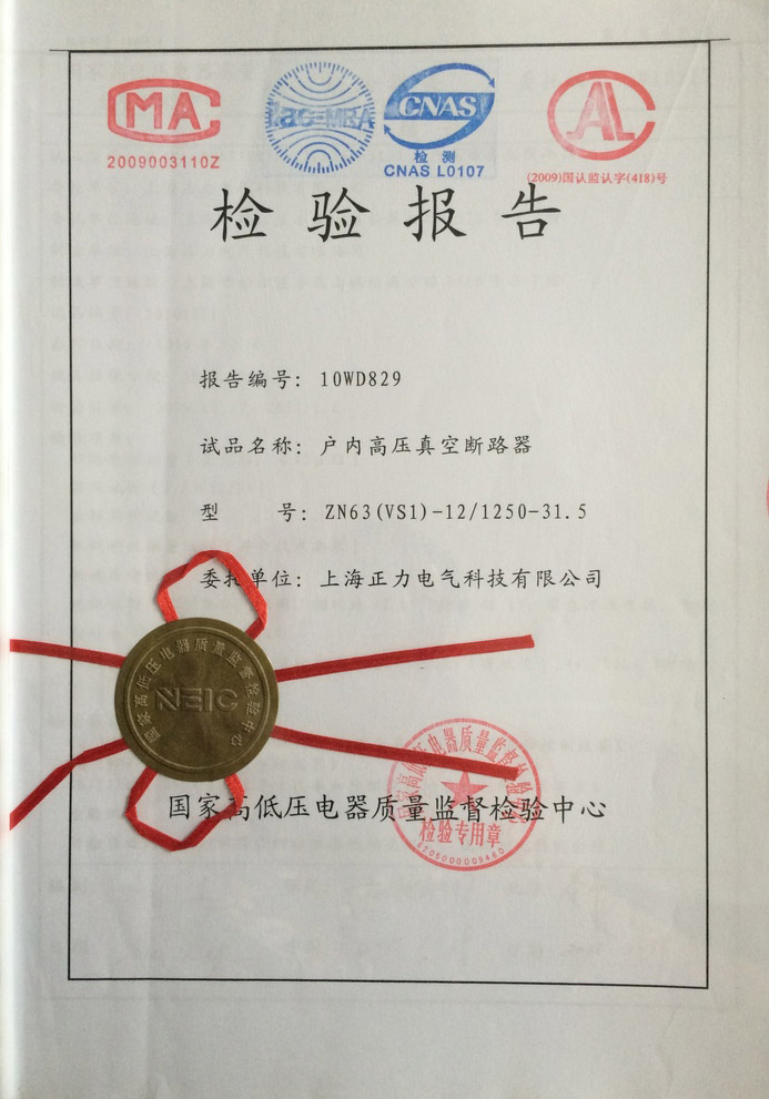 > 戶內高壓真空斷路器ZN63(VS1)-12-1250A-31.5檢驗報告